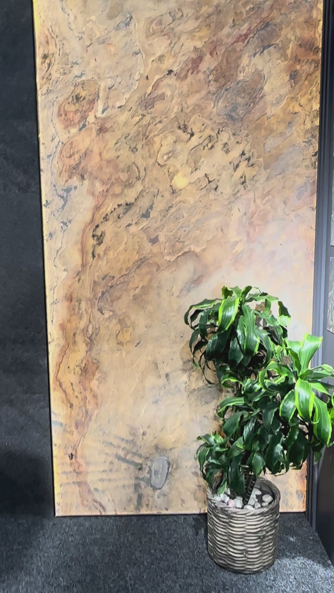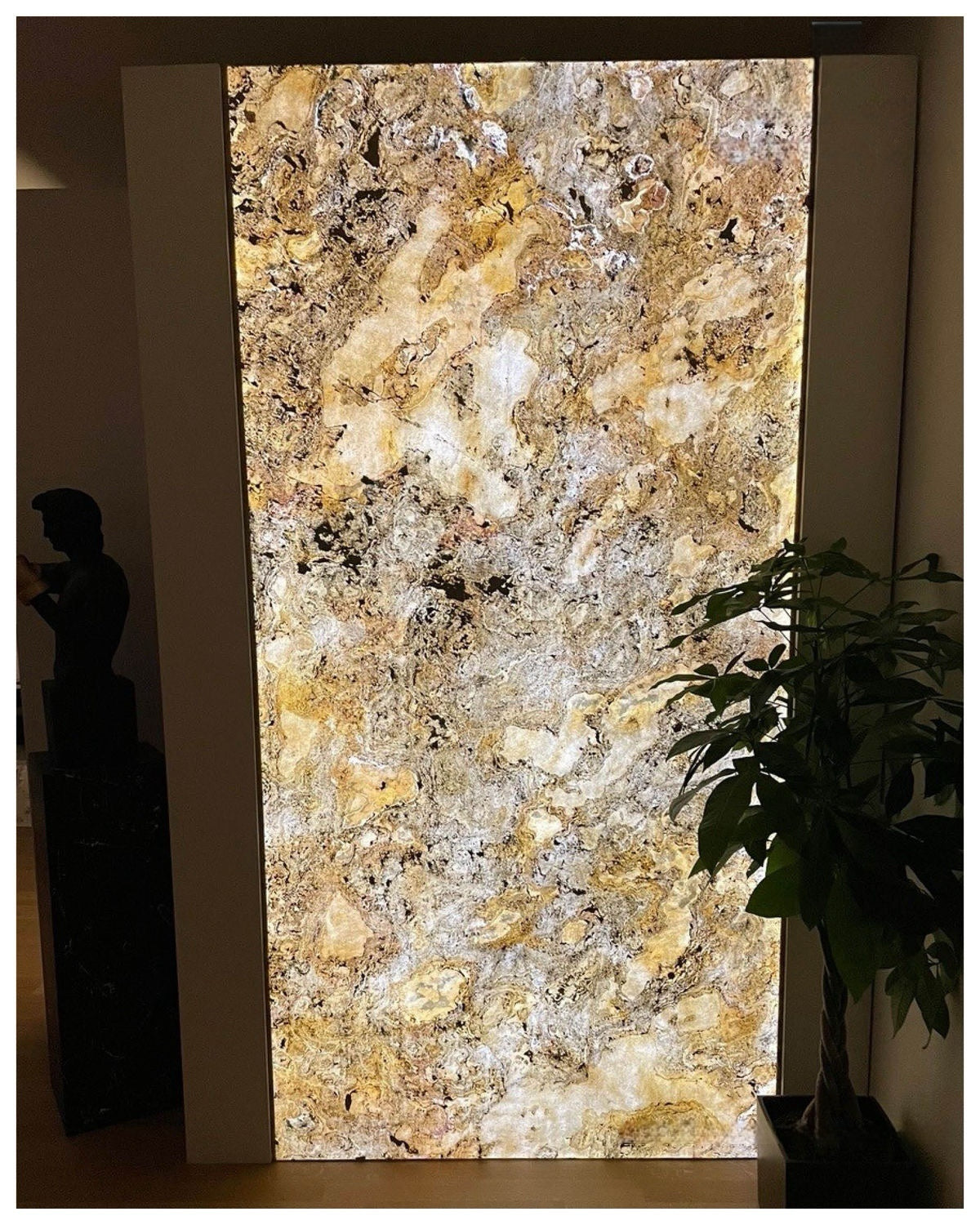 Gold Dune displays flowing layers of beige, gold, and soft bronze with organic mineral formations throughout. As a translucent natural stone veneer, it is designed for backlighting, bringing out its rich tone variation and depth. Ideal for feature walls, bar fronts, lighting installations, or reception desks, this material delivers a luxurious look with practical flexibility. It offers a warm, high-impact surface in both residential and commercial interiors.