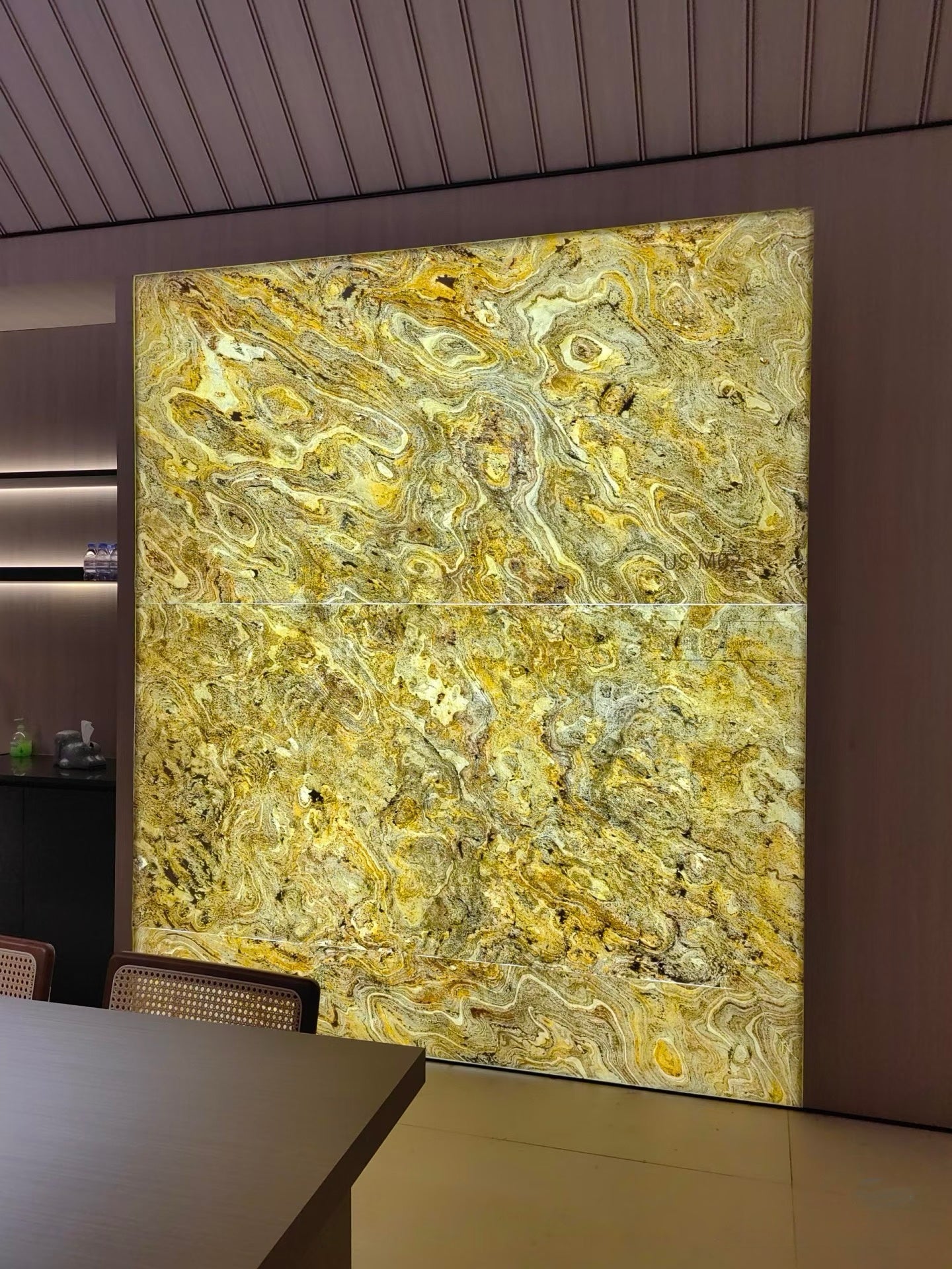 Golden Haze displays a layered palette of amber, ochre, and soft rose gold with flowing mineral movement. As a translucent natural stone veneer, it is designed for use in backlit applications, producing a warm, glowing effect that enhances the stone's depth and color variation. Ideal for illuminated wall panels, hospitality counters, or interior accents that call for a rich and inviting natural surface.